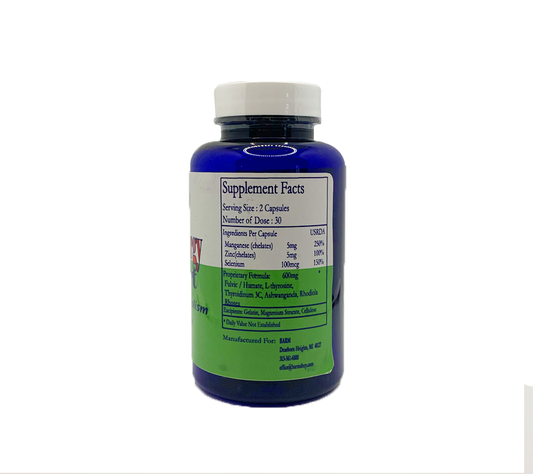 May support normal production of thyroid, which may help with symptoms of a general loss of energy, weaknesses, susceptibility to colds, respiratory infections, recurrent sickness due to low immunity, difficulty breathing, suffering from muscle cramping, low back pain, easy bruising, mental sluggishness, very poor memory, inability to rationalize or think, transient headaches, emotional stability, and mood swings with anxieties.